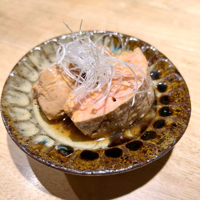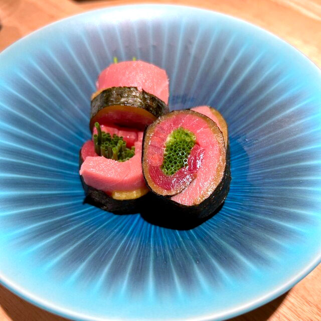 이곳에서 반드시 맛봐야 할 메뉴를 꼽으라면 단연 이곳의 대표 메뉴 중 하나는 ' 토로다쿠마키'입니다. 신선한 참치 뱃살의 여러 부위를 사용한 이 요리는 채 썬 단무지와 향긋한 김, 쪽파가 어우러져 완벽한 조화를 이룹니다. 유명 도예가 와다야마 마오의 터코이즈색 그릇에 담겨 나오는 모습은 예술 작품 그 자체입니다. 퇴근길 현지인들이 왜 이 메뉴를 하나씩 주문하는지 금방 이해하게 됩니다.